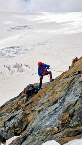 The Spaghetti Tour is a multi-day high-altitude traverse linking the classic 4000 m peaks of the Monte Rosa range, straddling the border between Switzerland and Italy.